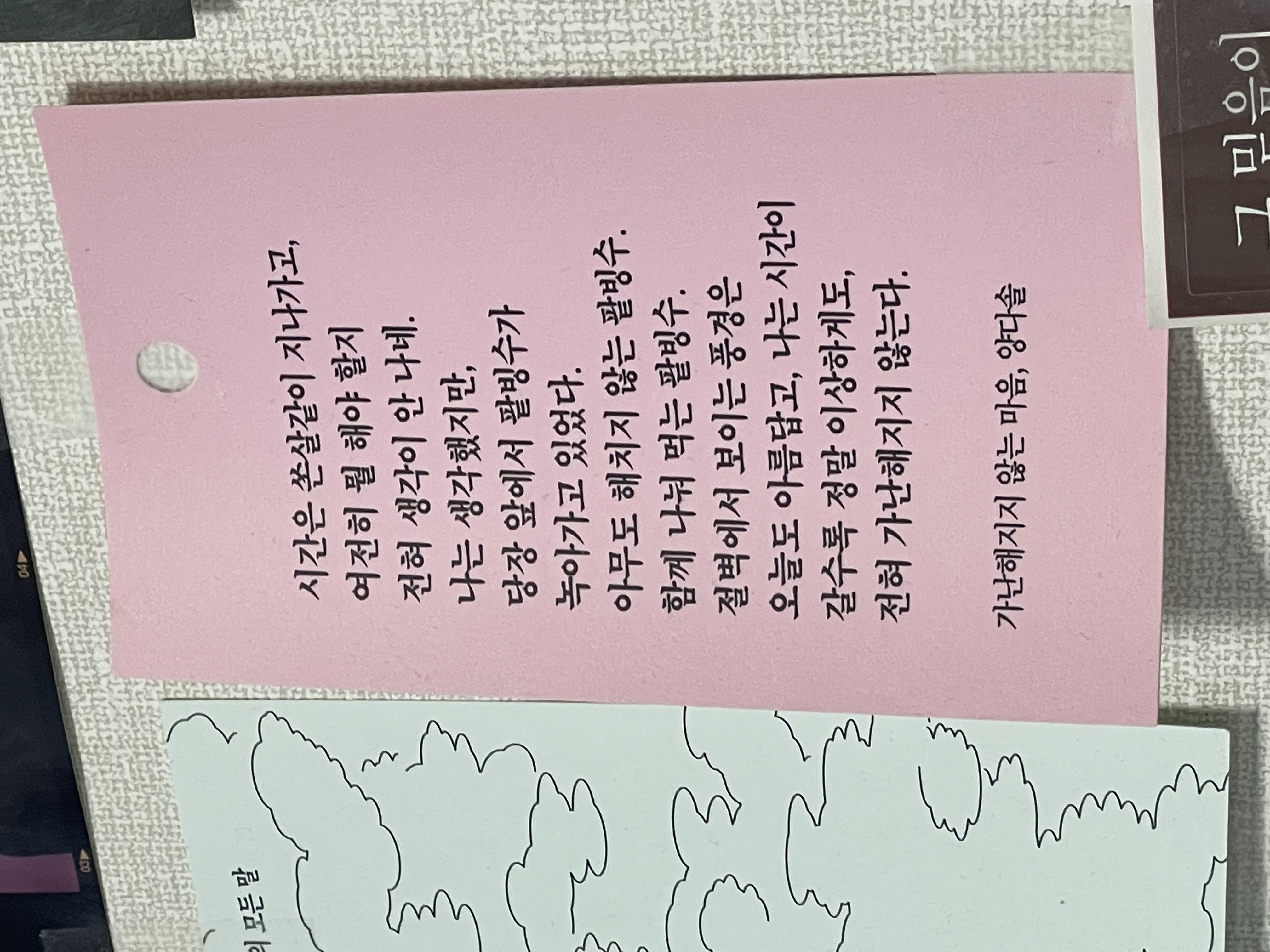 사진은 제 방 벽에 붙어있는 걸 찍은 겁니다. 도서전에서 받아온 엽서인데, 매일 아침 옷을 입을 때마다 눈에 들어와요. 나갈 준비를 하긴 하지만 내가 지금 뭘 하러 가는 건지, 열심히 하면 뭐가 되긴 하는 건지 혼란스러울 때 이걸 보고 나면 머릿속이 단번에 정리가 됩니다. 나눠 먹을 팥빙수 같은 것들이 내게도 많다고, 그래서 나는 가난하지도 불행하지도 않다고요. 마치 부자의 서민 체험 마인드가 된다고 할까요.